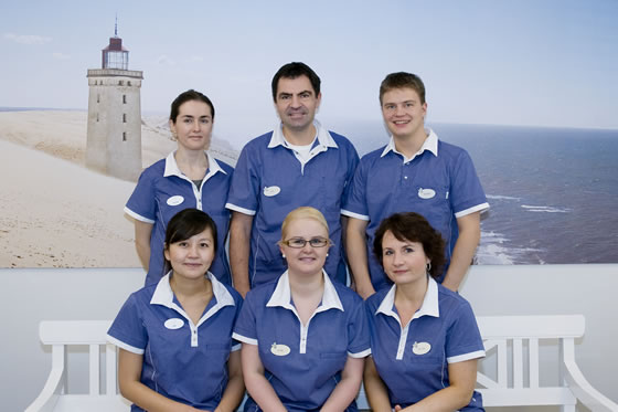 Tandlægen står i midten, sammen med personalet fra klinikken.